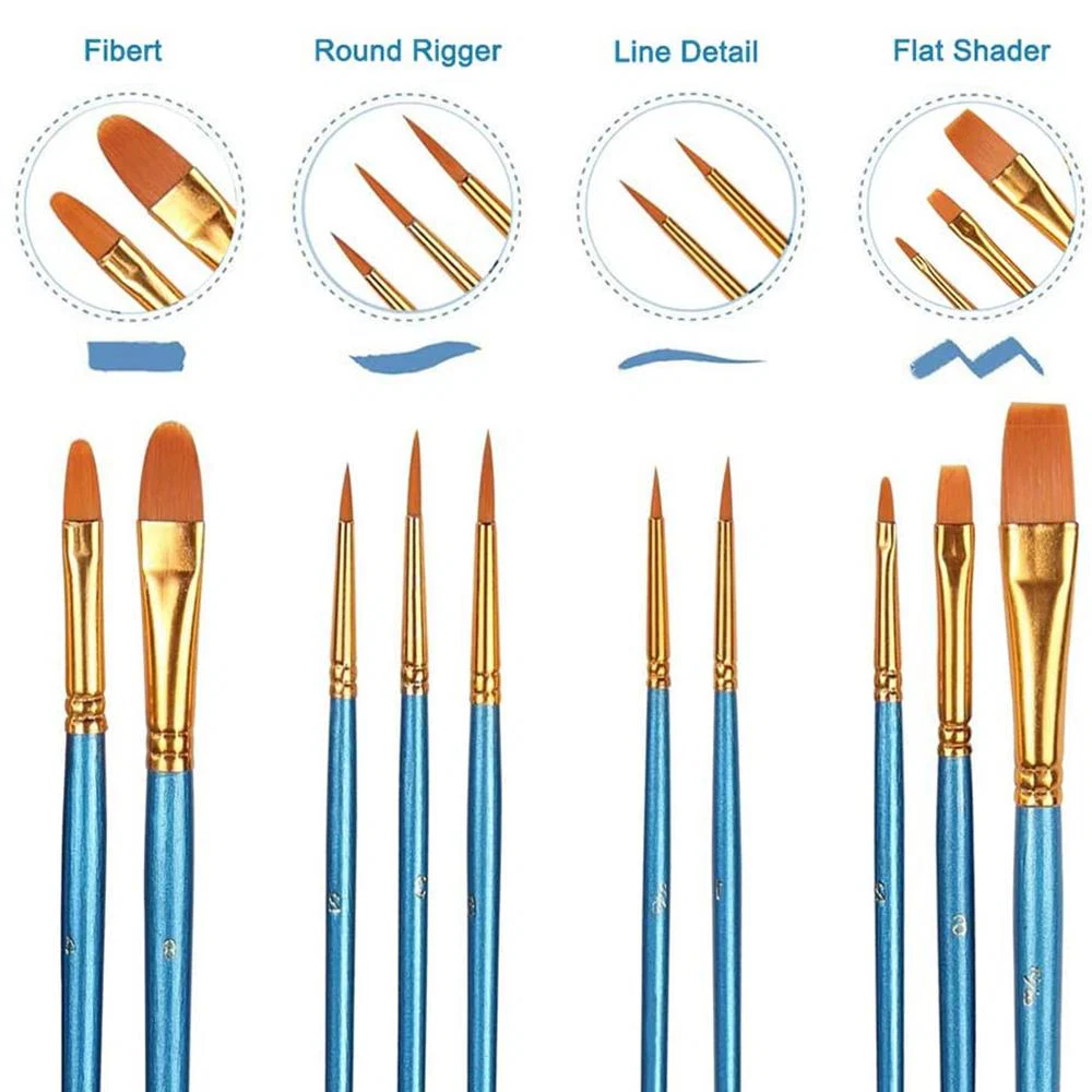 Nylon hairs and wooden handle. 10 numbers included. Each brush is labeled and has a distinct shape to match the painting area.
