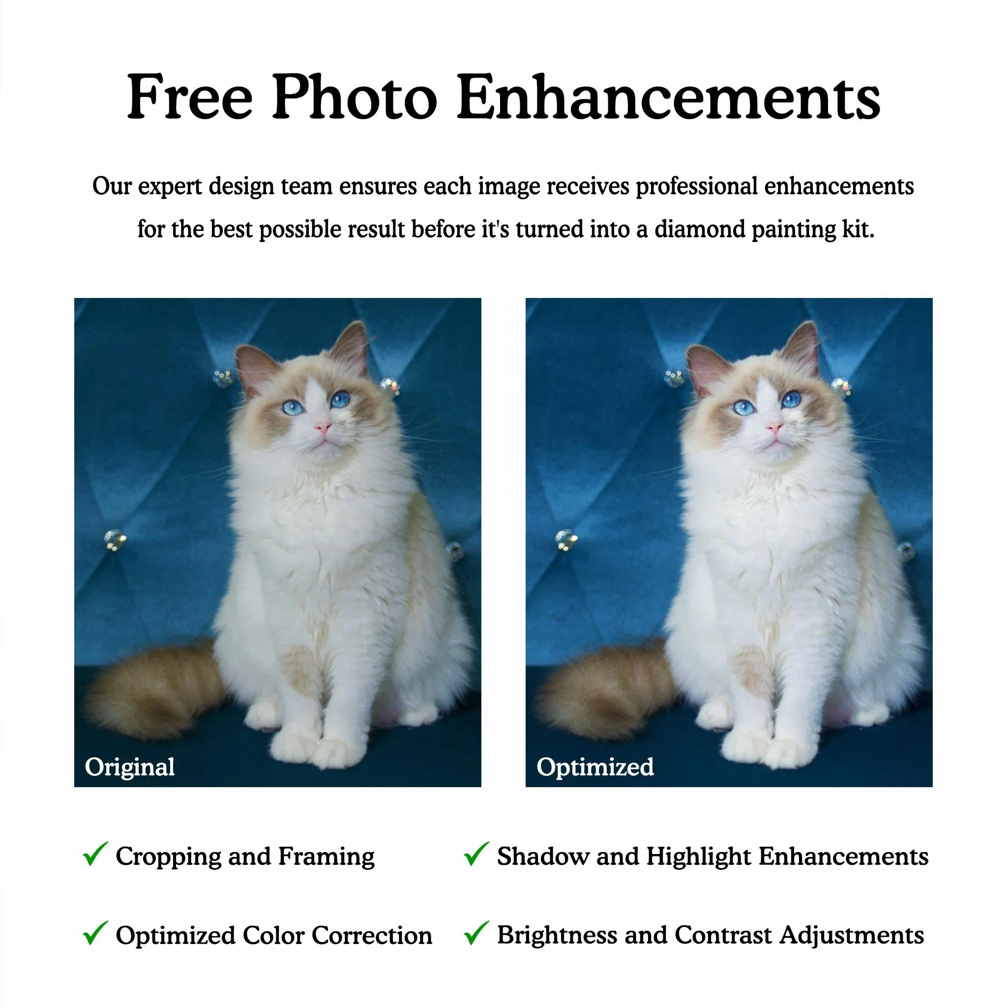 Our expert design team reviews and optimizes each and every image before it's turned into a diamond painting kit. What enhancements do we make to your photo?